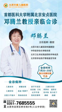 此次,应广大患儿家长要求,7月22-23日,太原天使儿童医院特邀首都医科大学附属北京安贞医院邓腾兰教授,与我院专家一起为孩子们“把脉”会诊,共同为多动症、抽动症、自闭症、语言障碍、智力低下等特殊疾病患儿进行联合会诊,给孩子带来康复的希望!同时,为了保证会诊质量,每日仅限15个预约名额,患儿家长一定要提前预约哦!