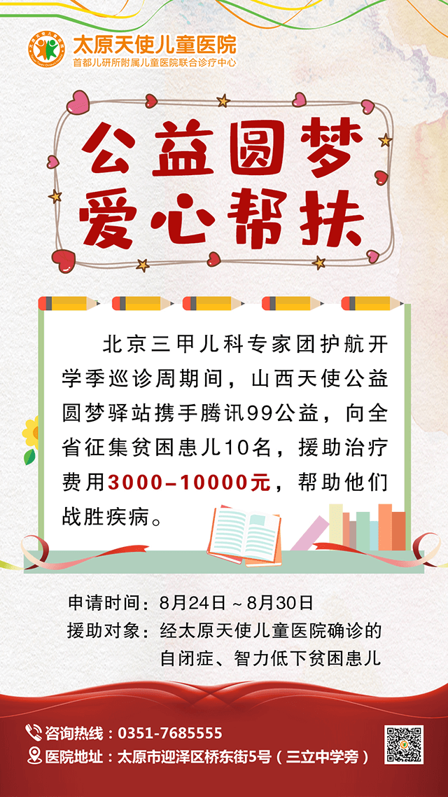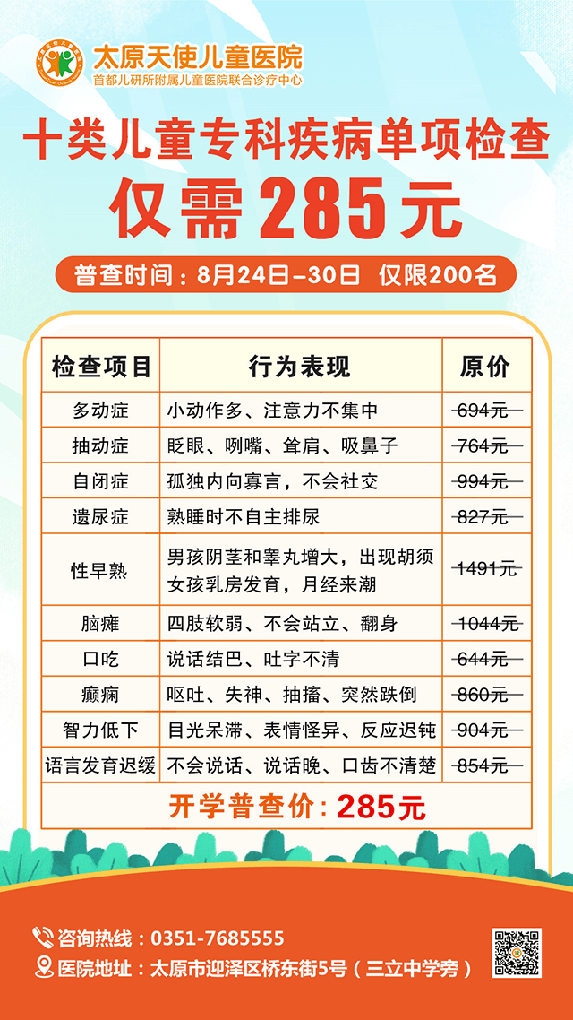 转眼又到了开学季,为了帮助家长及时了解孩子的生长发育、行为及心理状况,让更多孩子健康成长,8月24日——8月30日,首都儿研所附属北京儿童医院、全科医学协作平台与太原天使儿童医院联合发起“北京儿科专家团巡诊周护航开学季”活动。还推出多项检查费用优惠活动,符合条件的贫困患儿还可享受3000-10000元的治疗费用援助,同时,为守护星孩,太原天使儿童医院为自闭症、智力低下患儿免费赠送“防走失智能电话手表”。