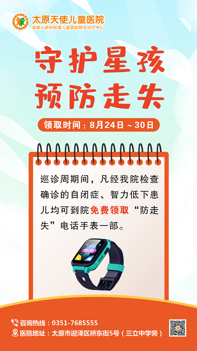 在专家会诊周期间,经太原天使儿童医院检查确诊的自闭症、智力低下患儿可到院免费赠送“防走失”电话手表,以减少自闭症、智力低下患儿走失问题,给更多的自闭症儿童外出时加上一道 “安全锁”。